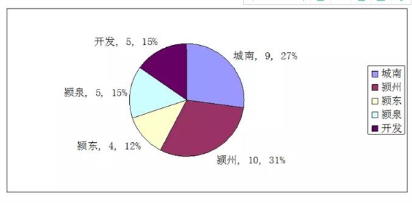 一、套数:2018年1—3月阜阳公寓租赁成交34套(其中,城南新区9套,占比27%;颍州区10套,占比31%;颍东区4套,占比12%;开发区5套,占比15%;颍泉区5套,占比15%。)